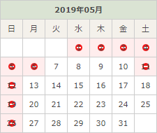 5月のお休みは各日曜日、11日(土)、