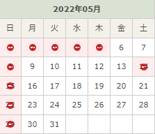 5月のお休みは各日曜日、14日(土)、